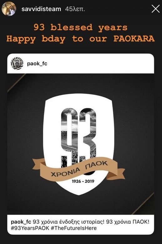 Μέσω ενός story στο Instagtam, ο Γιώργος Σαββίδης ευχήθηκε με το δικό του τρόπο στον ΠΑΟΚ, ο οποίος σήμερα γιορτάζει τα 93 χρόνια από τη ίδρυσή του.