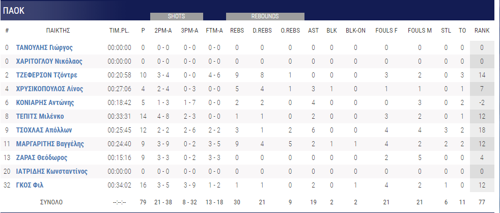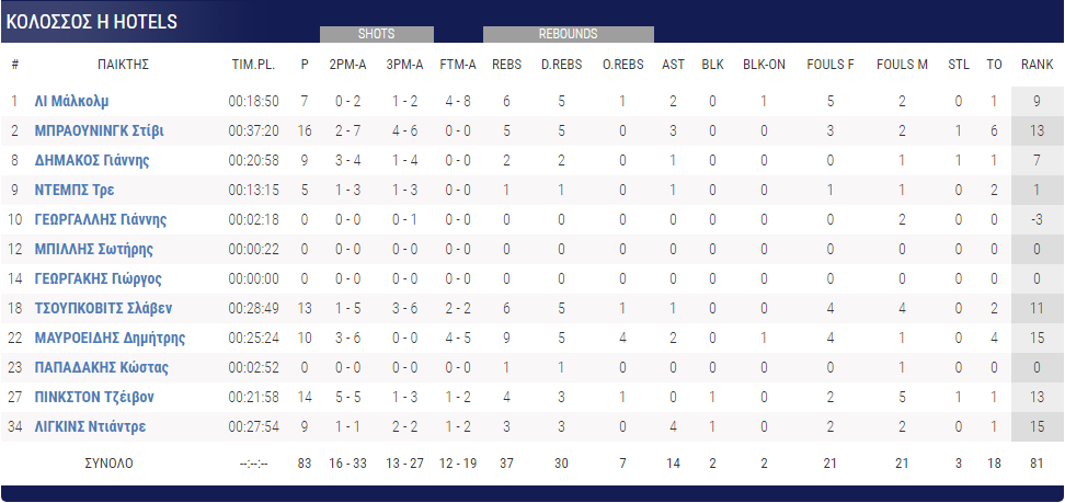 Ο ΠΑΟΚ, ο οποίος παρατάχθηκε δίχως τους Χάτσερ και Γκάρετ εξαιτίας της αποχής των δυο παικτών, δεν μπόρεσε σε κανένα σημείο του ματς να βρει ρυθμό. Αυτό είχε ως αποτέλεσμα, ο ψυχωμένος Κολοσσός να πανηγυρίσει μια μεγάλη νίκη με 79-83. Πλέον ευελπιστεί πως στα εναπομείναντα 31 δευτερόλεπτα που θα παιχτούν απέναντι στο Λαύριο θα καταφέρει να πάρει τη νίκη που θα του δώσει κάποιες ελπίδες για τη «σωτηρία».
