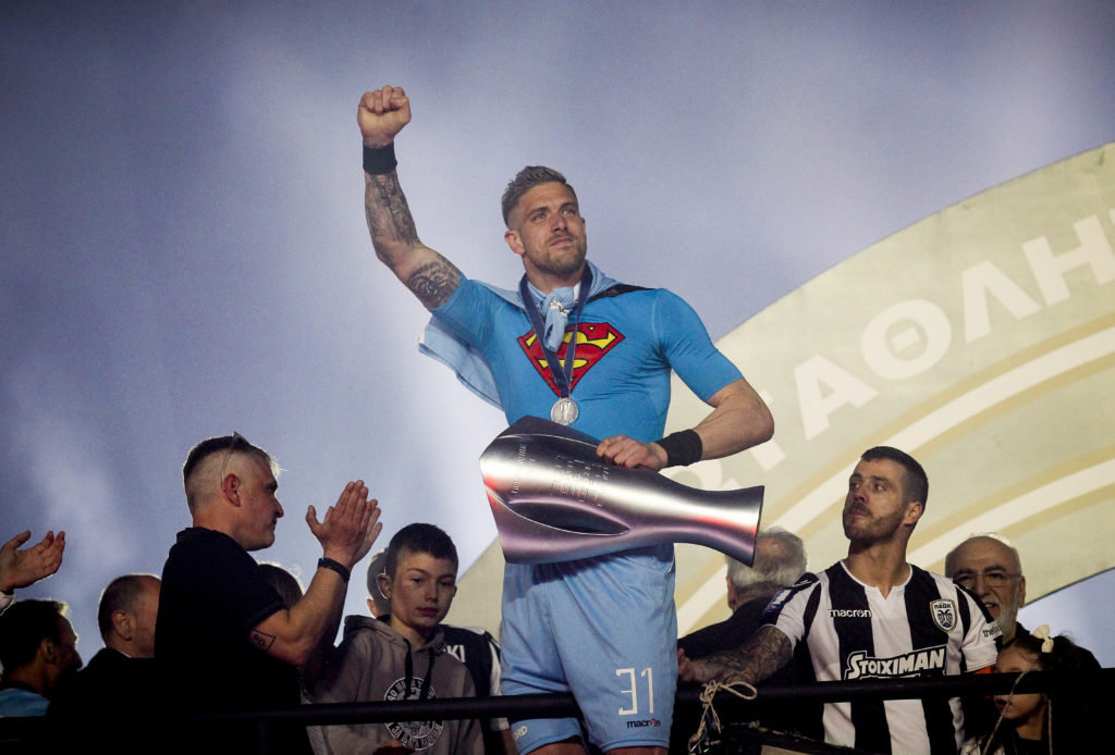 Ρεσιτάλ έδωσε ο Αλέξανδρος Πασχαλάκης κατά τη διάρκεια της φιέστας της κατάκτησης του πρωταθλήματος από τον ΠΑΟΚ. Ο Έλληνας τερματοφύλακας είχε ετοιμάσει ένα μικρό σόου και στο τέλος έμεινε με ένα μπλουζάκι με το σήμα του Superman.