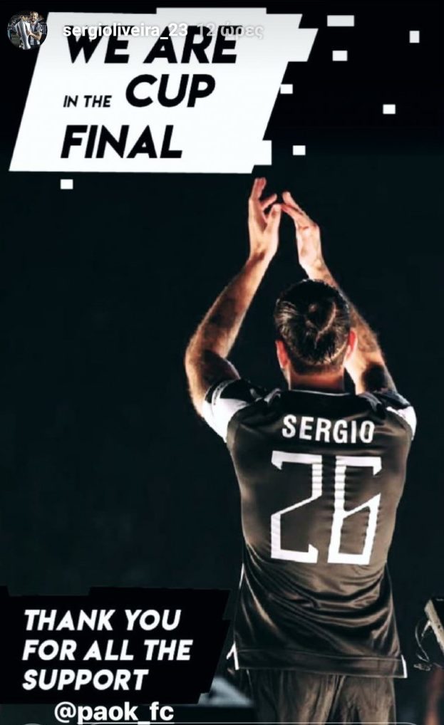 Στο μεταξύ, ο Σέρτζιο Ολιβέιρα ευχαρίστησε τον κόσμο του ΠΑΟΚ για τη στήριξή του και έδωσε ραντεβού με τους οπαδούς στον τελικό του Κυπέλλου. «Είμαστε στον τελικό Κυπέλλου. Σας ευχαριστώ για όλη τη στήριξη», έγραψε ο Ολιβέιρα.