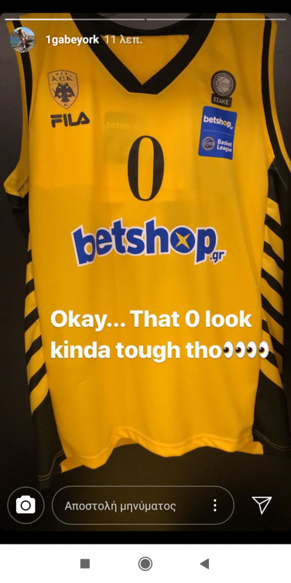 Η ΑΕΚ δίνει απόψε φιλικό προπονητικού χαρακτήρα στο ΟΑΚΑ με αντίπαλο το Λαύριο. Το νέο μεταγραφικό απόκτημα της «ένωσης», Γκέιμπ Γιορκ αναμένεται να κάνει το ανεπίσημο ντεμπούτο του. Ο Αμερικανός γκαρντ, «παρουσίασε» μέσω Instagram τη νέα του φανέλα, η οποία θα φέρει τον αριθμό «0» στην πλάτη.
