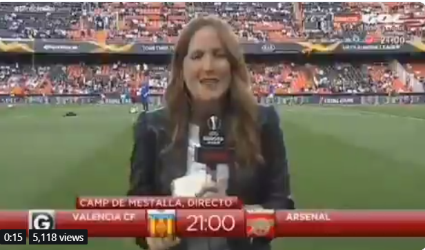 Τους… κινδύνους του επαγγέλματος γνώρισε από πρώτο χέρι Ισπανίδα δημοσιογράφος του τηλεοπτικού δικτύου Gol, η οποία βρισκόταν στον αγωνιστικό χώρο κατά την προθέρμανση των παικτών της Βαλένθια και της Άρσεναλ, όταν μια μπάλα εμφανίστηκε από το… πουθενά και τη χτύπησε με δύναμη στο κεφάλι από πίσω.