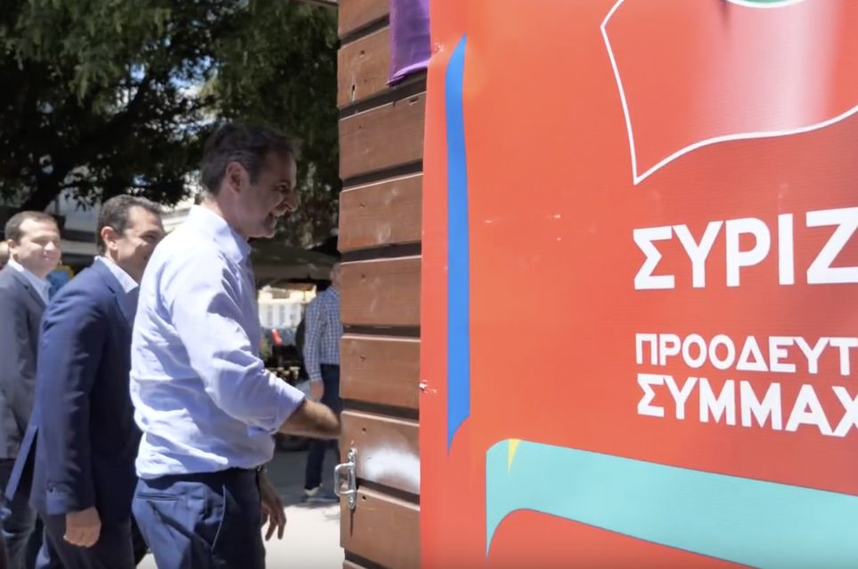 Κατά τη διάρκεια της βόλτας του στην πόλη, ο πρόεδρος της Νέας Δημοκρατίας σταμάτησε σε ένα προεκλογικό περίπτερο του ΣΥΡΙΖΑ, όπου χαιρέτισε τους εθελοντές και τα μέλη του κόμματος που βρίσκονταν εκεί.