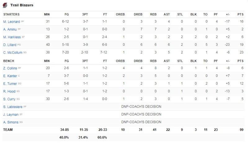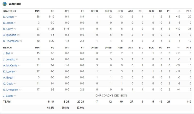 Μεγαλειώδης εμφάνιση από τον Ντρέιμοντ Γκριν, ο οποίος έκανε triple double, με 20 πόντους, 13 ριμπάουντ και 12 ασίστ, αλλά και από τον Στεφ Κάρι που πέτυχε 36 πόντους. Από τους Πόρτλαντ ξεχώρισε για μια ακόμη φορά το δίδυμο ΜακΚόλουμ και Λίλαρντ που πέτυχαν 23 και 19 πόντους αντίστοιχα.