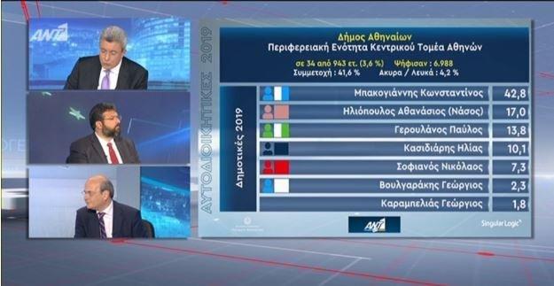 Μεγάλο προβάδισμα για το δήμο της Αθήνας έχει ο Κώστας Μπακογιάννης ενώ μάχη θα δοθεί για τη δεύτερη θέση και τον αντίπαλό του. Αν και τα πρώτα στοιχεία είναι λίγα ο Κώστας Μπακογιάννης συγκεντρώνει 42,08%, ο Νάσος Ηλιόπουλος: 17% ενώ ο Παύλος Γερουλάνος 13,8%.