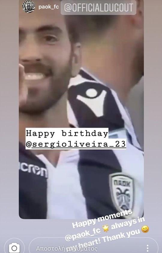 Η ΠΑΕ ΠΑΟΚ, μέσω ανάρτησης στο Twitter ευχήθηκε «χρόνια πολλά» στον Σέρτζιο Ολιβέιρα, με αφορμή την συμπλήρωση του 27ου έτους της ηλικία του. Ο Πορτογάλος μεσοεπιθετικός «απάντησε» στο βίντεο του «δικεφάλου του Βορρά», αποχαιρετώντας ουσιαστικά τους Θεσσαλονικείς, λέγοντας χαρακτηριστικά: «Ζήσαμε χαρούμενες στιγμές στον ΠΑΟΚ. Θα είναι πάντα στην καρδιά μου. Σας ευχαριστώ».