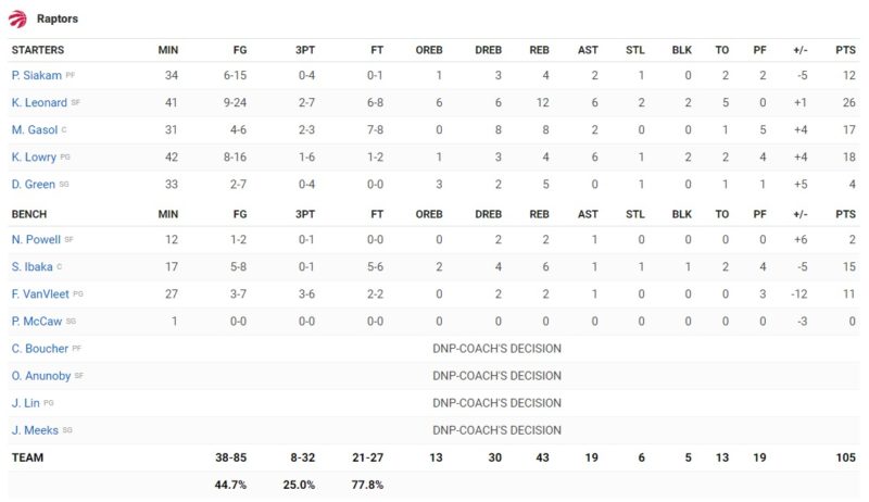 Από την πλευρά των Ράπτορς, ο Καουάι Λέοναρντ ήταν για ένα ακόμα παιχνίδι εξαιρετικός (26 πόντους, 12 ριμπάουντ), με τους Λόουρι και Γκασόλ να ακολουθούν έχοντας 18 και 17 πόντους αντίστοιχα.