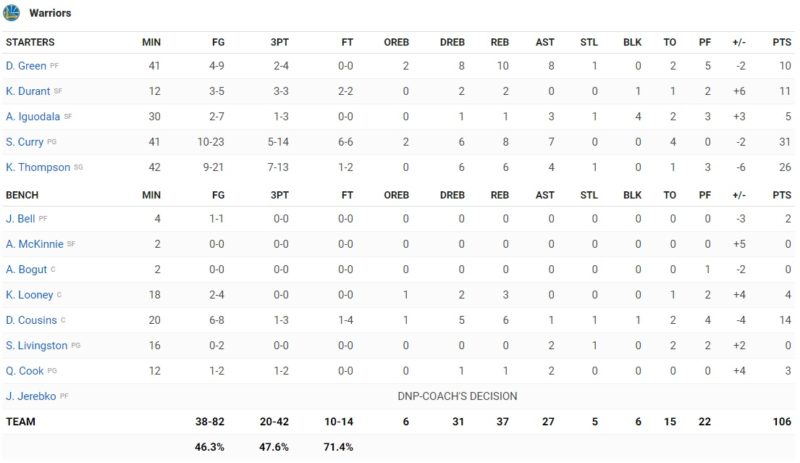Για τους Γουόριορς, ο Στεφ Κάρι πραγματοποίησε μια ακόμα εκπληκτική εμφάνιση, έχοντας 31 πόντους, 8 ριμπάουντ και 7 ασίστ. Πολύ καλός και ο Κλέι Τόμπσον, ο οποίος ολοκλήρωσε το ματς με 26 πόντους.
