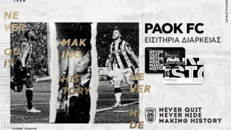 Η προσπάθεια για τη διατήρηση της κορυφής στις εγχώριες διοργανώσεις και την επίτευξη της πρόκλησης των ομίλων του Champions League ξεκινά από την κερκίδα και την παρουσία του κόσμου στο γήπεδο της Τούμπας. Από τα εισιτήρια διαρκείας.14.06.2019 Την Τρίτη (18.06) έφτασε η στιγμή να κρατήσετε τη δική σας θέση στο «σπίτι» μας και ν’ αποτελέσετε ενεργό μέλος του ΠΑΟΚ σ’ ένα νέο γοητευτικό ταξίδι, τη σεζόν 2019-20. Η πώληση των εισιτηρίων διαρκείας της νέας αγωνιστικής περιόδου που περιλαμβάνουν τα προκριματικά και τη φάση των ομίλων των ευρωπαϊκών διοργανώσεων και όλους τους αγώνες σε Super League, Play Offs, Κύπελλο Ελλάδας ξεκινά αποκλειστικά μέσω της επίσημης ιστοσελίδας μας www.paokfc.gr.