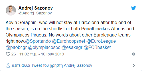 «Ο Σεραφέν ο οποίος δεν θα παραμείνει στην Μπαρτσελόνα μετά το τέλος της σεζόν, είναι στην λίστα και του Παναθηναϊκού αλλά και του Ολυμπιακού. Καμία κουβέντα για άλλες ομάδες της Ευρωλίγκας μέχρι τώρα», γράφει χαρακτηριστικά στην ανάρτησή του ο Αντρέι Σαζόνοφ.