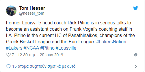 Η ανάρτηση του Τομ Χέσερ: «Ο πρώην προπονητής του Λούιβιλ, Ρικ Πιτίνο, είναι σε σοβαρές συζητήσεις για να γίνει μέλος στο προπονητικό επιτελείο του Φρανκ Φόγκελ στους Λέικερς».