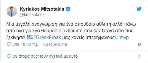 Αρκετοί έσπευσαν να τον συγχαρούν για την τεράστια αυτή επιτυχία, μεταξύ αυτών και ο πρόεδρος της Νέας Δημοκρατίας, Κυριάκος Μητσοτάκης, ο οποίος μέσω ανάρτησης στο Twitter ανέφερε χαρακτηριστικά: «Μια μεγάλη αναγνώριση για ένα σπουδαίο αθλητή αλλά πάνω από όλα για ένα θαυμάσιο άνθρωπο που δεν ξεχνά από που ξεκίνησε! Greak Freak μας κάνεις υπερήφανους!».
