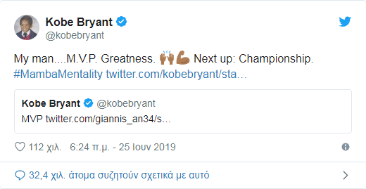 «Υπόκλιση» στον Γιάννη Αντετοκούνμπο και από τον Κόμπε Μπράιαντ. Ο «θρύλος» των Λέικερς, μέσω ανάρτησης στο Twitter αποθέωσε τον «Greek Freak» με αφορμή την βράβευσή του ως MVP της κανονικής διάρκειας στο ΝΒΑ.