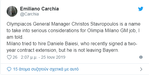 Μάλιστα, ο Ιταλός ρεπόρτερ ανέφερε πως η ομάδα από το Μιλάνο πρότεινε τη συγκεκριμένη θέση και στον Ντανιέλε Μπαιέσι, ο οποίος όμως ξεκαθάρισε πως δεν πρόκειται να αποχωρήσει από την Μπάγερν Μονάχου, με την οποία ανανέωσε πρόσφατα για άλλα δυο χρόνια.