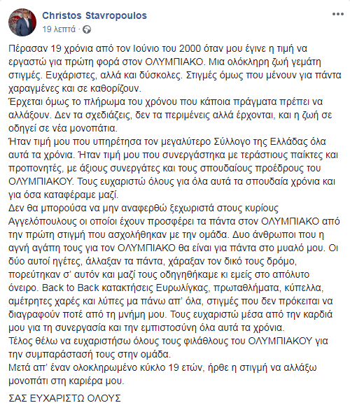 «Βόμβα» στον Ολυμπιακό έριξε ο Χρήστος Σταυρόπουλος. Ο μέχρι πρότινος γενικός Διευθυντής της Ερυθρόλευκης ΚΑΕ, μέσω ανάρτησης στο προφίλ του στο facebook, ανακοίνωσε την αποχώρησή του από τους Πειραιώτες ύστερα από 19 ολόκληρα χρόνια.