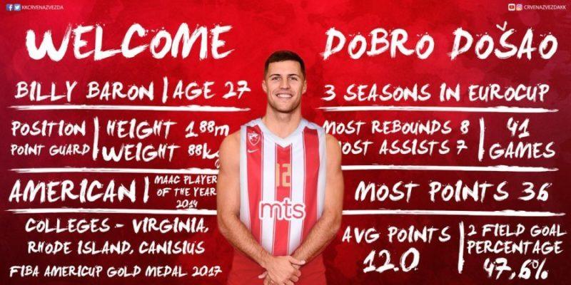 Η πρώτη μεταγραφική κίνηση του Ερυθρού Αστέρα επί εποχής Μίλαν Τόμιτς είναι ο Μπίλι Μπάρον. Η ομάδα του Βελιγραδίου, που θα λάβει μέρος στο Euro Cup, ανακοίνωσε την συμφωνία της με τον Αμερικανό γκαρντ, ο οποίος είναι πολύ καλός σκόρερ.