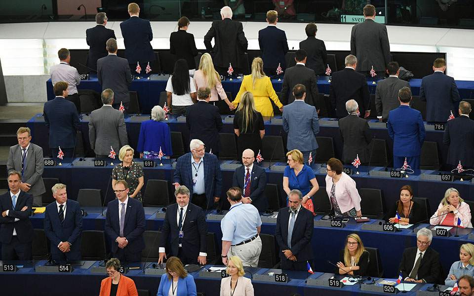 Οι «ευρωβουλευτές» του βρετανικού κόμματος του Brexit γύρισαν την πλάτη τους κατά την ανάκρουση του ευρωπαϊκού ύμνου στην εναρκτήρια πανηγυρική συνεδρίαση του Ευρωπαϊκού Κοινοβουλίου στο Στρασβούργο.