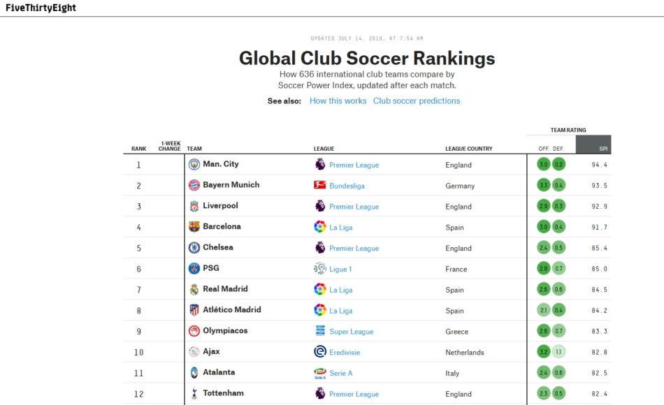 Εδώ, μπορείτε να μάθετε περισσότερες πληροφορίες σχετικά με τον τρόπο υπολογισμού των μετρήσεων και ειδικά για το SPI, το Soccer Power Index βάσει του οποίου γίνεται η κατάταξη κάθε συλλόγου. Στην κορυφή βρίσκεται η Σίτι, ακολουθεί η Μπάγερν, η Λίβερπουλ, η Μπαρτσελόνα, η Τσέλσι, η Παρί, η Ρεάλ, η Ατλέτικο και ακριβώς κάτω από τον Ολυμπιακό βρίσκεται ο Άγιαξ, η Αταλάντα και η Τότεναμ!