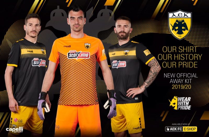 Όπως αναμενόταν, έγινε σήμερα γνωστή η νέα εκτός έδρας φανέλα της ΑΕΚ για τη σεζόν 2019-20. Αυτή είναι σε μαύρο χρώμα με ορισμένες κίτρινες λεπτομέρειες στο στήθος, τους ώμους και τα μανίκια.