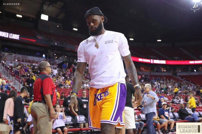 Φορώντας μια βερμούδα με τα χρώματα των Λέικερς, ο ΛεΜπρον Τζέιμς παρακολούθησε το παιχνίδι των «λιμνανθρώπων» με το Ντιτρόιτ στο πλαίσιο του summer league.