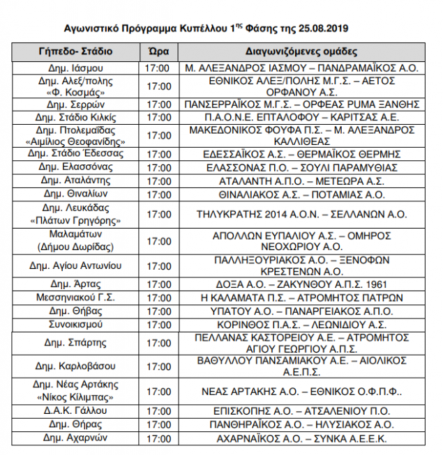 Γνωστό έγινε το καλεντάρι του πρώτου γύρου του Κυπέλλου Ελλάδας από την Ελληνική Ποδοσφαιρική Ομοσπονδία. Οι αγώνες θα λάβουν χώρα στις 25 Αυγούστου και θα είναι μονοί, δίχως ρεβάνς. Σε αυτούς θα συμμετάσχουν οι Κυπελλούχοι των ΕΠΣ, όχι, όμως, αυτοί της Δυτικής Αττικής, του Λασιθίου, της Ημαθίας, της Θεσσαλίας, της Χαλκιδικής και της Δωδεκανήσου, που προβιβάστηκαν στη Football League.
