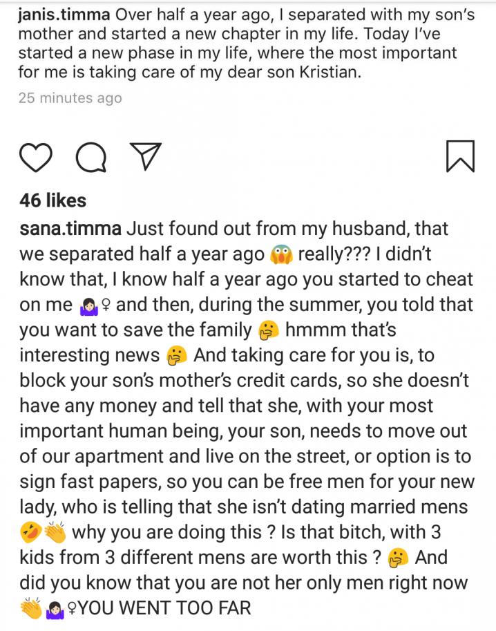 Βλέποντας τη συγκεκριμένη ανάρτηση η πρώην γυναίκα του, απάντησε προβαίνοντας σε αποκαλύψεις: «Μόλις έμαθα από τον σύζυγο μου πως χωρίσαμε εδώ και μισό χρόνο. Αλήθεια; Δεν το ήξερα αυτό. Αυτό που ξέρω είναι πως εδώ και περίπου έξι μήνες άρχισε να με απατάς και μετά, μέσα στο καλοκαίρι, μου είπες πως θέλεις να σώσεις την οικογένεια. Μμμ… αυτό έχει ενδιαφέρον. Και το ενδιαφέρον σου, είναι να μπλοκάρεις στη μάνα των αγοριών σου τις πιστωτικές κάρτες, ώστε να μην έχει χρήματα, και τα παιδιά σου να φύγουν από το διαμέρισμα ώστε να ζήσουν στους δρόμους. Η άλλη επιλογή είναι να υπογράψει στα γρήγορα κάποια χαρτιά, ώστε να είσαι ελεύθερος άνδρας για τη νέα σου κυρία, που λέει πως δεν κάνει ραντεβού με παντρεμένους άνδρες! Γιατί το κάνεις αυτό; Αυτή η σκύλα με τρία παιδιά, από τρεις διαφορετικούς άνδρες, το αξίζει αυτό; Ξέρεις άραγε πως δεν είσαι ο μόνος άνδρας στη ζωή της τώρα; Το πήγες πολύ μακριά…»