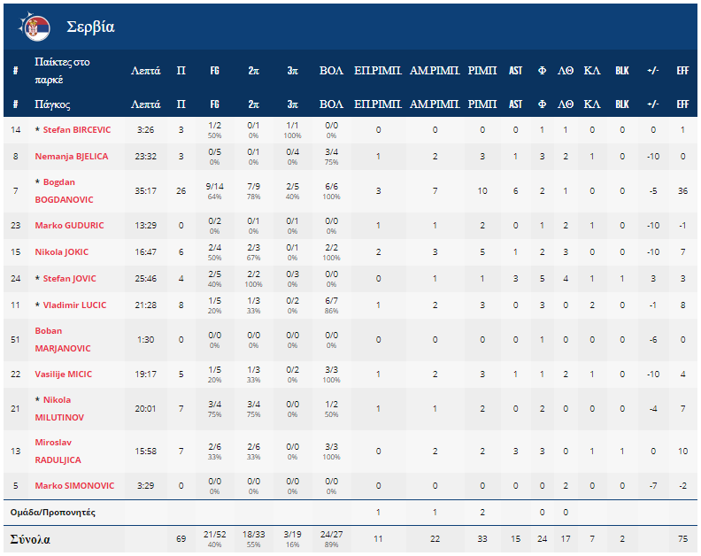 Μ’ αυτά και μ’ αυτά η «φούρια ρόχα» απομακρυνόταν διαρκώς, κερδίζοντας αυτοπεποίθηση από την εκπληκτική της άμυνα, που είχε κάνει τους «όρλοβι» να σιγήσουν και να μην θυμίζουν σε τίποτα την ομάδα που θαυμάσαμε στα τέσσερα προηγούμενα παιχνίδια της διοργάνωσης. Με μόλις πέντε πόντους παθητικό στα πρώτα πέντε τουλάχιστον λεπτά εκτόξευσε τη διαφορά στο +21, εντούτοις, από το σημείο αυτό είδε τους Σέρβους να δυναμώνουν και αυτοί από την πλευρά τους στην πίσω πλευρά του παρκέ, να δέχονται μόλις δύο καλάθια και κλείνουν την ψαλίδα στους 11 πόντους.
