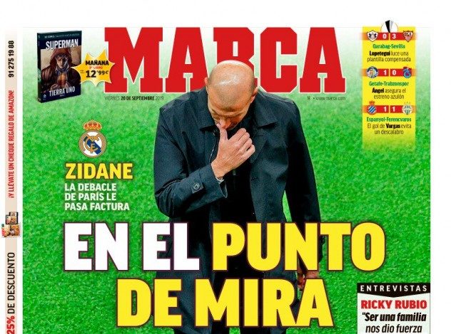 Τόσο η Marca όσο και η AS φιλοξενούν τη «Βασίλισσα» στα πρωτοσέλιδά τους, αναφέροντας πως η θέση του Γάλλου προπονητή στον πάγκο μετά την τελευταία εμφάνιση στην Ευρώπη θεωρείται επισφαλής.