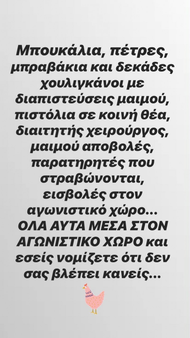 «Μπουκάλια, πέτρες, μπραβάκια και δεκάδες χουλιγκάνοι με διαπιστεύσεις μαϊμού, πιστόλια σε κοινή θέα, διαιτητής χειρουργός, μαϊμού αποβολές, παρατηρητές που στραβώνονται, εισβολές στον αγωνιστικό χώρο… Όλα αυτά μέσα στον αγωνιστικό χώρο και εσείς νομίζετε ότι δεν σας βλέπει κανείς…».