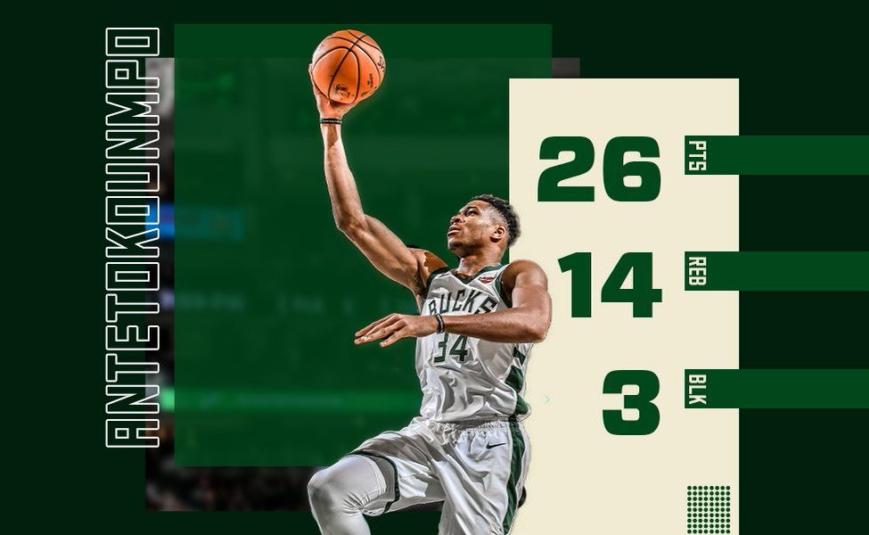 Ο Γιάννης Αντετοκούνμπο πέτυχε ένα ακόμα double-double, συνεχίζοντας τη… συνήθεια όλων των προηγούμενων αναμετρήσεων στις οποίες αγωνίστηκε, τελειώνοντας το ματς με 26 πόντους (7/9 βολές, 8/11 δίποντα, 1/4 τρίποντα) και 14 ριμπάουντ, ενώ έδωσε επίσης 2 ασίστ και έκανε 3 κλεψίματα.