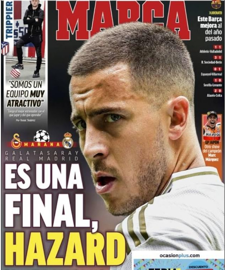 Δεδομένης της απουσίας των τραυματιών Μπέιλ και Μόντριτς, μεγάλο βάρος έχει πέσει και στον Εντέν Αζάρ, από τον οποίο οι Ισπανοί περιμένουν να αποδείξει την -αγωνιστική και οικονομική- αξία του, με το χθεσινό πρωτοσέλιδο της Marca να μην αφήνει περιθώρια για παρεξηγήσεις…