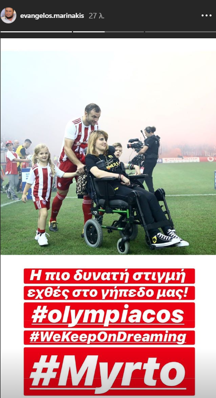 Με αναρτήσεις του στα Μέσα κοινωνικής δικτύωσης, ο διοικητικός ηγέτης της ΠΑΕ Ολυμπιακός, Βαγγέλης Μαρινάκης στάθηκε στη Μυρτώ και τις συγκινητικές στιγμές που δημιούργησε η παρουσία της στο «Γ. Καραϊσκάκης». Μάλιστα, χαρακτήρισε ως πιο δυνατή στιγμή του ντέρμπι την παρουσία της.
