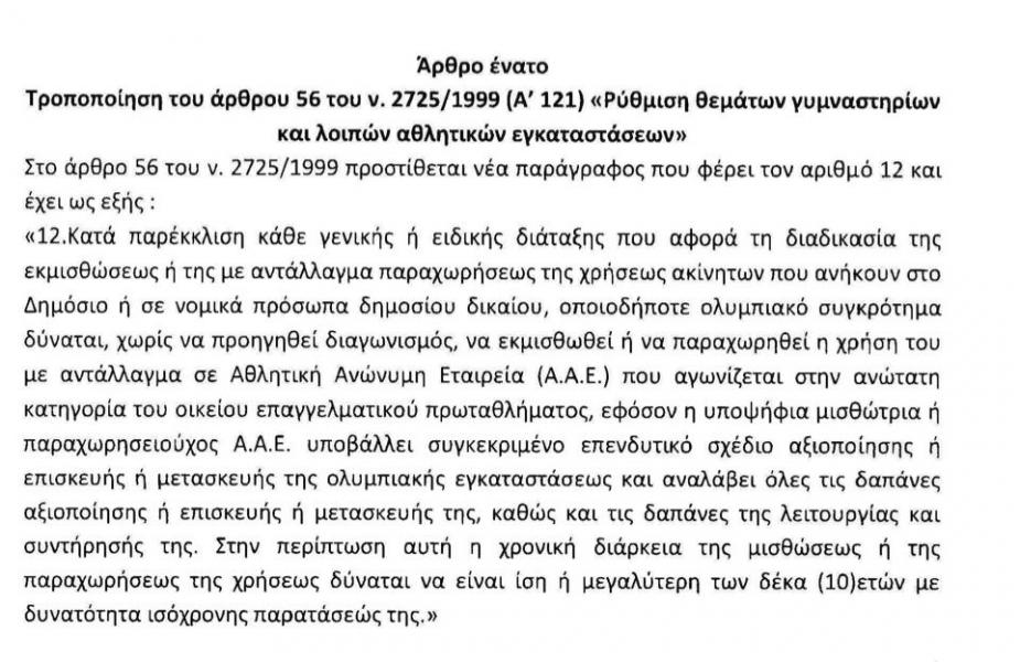 Συγκεκριμένα, στο νομοσχέδιο του υφυπουργού Αθλητισμού Λευτέρη Αυγενάκη, εντάχθηκε και η τροπολογία που θα επιτρέψει να επιταχυνθούν οι διαδικασίες μέχρι την πλήρη συμφωνία της ΚΑΕ ΑΕΚ με την Πολιτεία, μέσω της άρσης του εμποδίου της υποχρέωσης διεξαγωγής διαγωνισμού για την παραχώρηση του δικαιώματος χρήσης του γηπέδου.