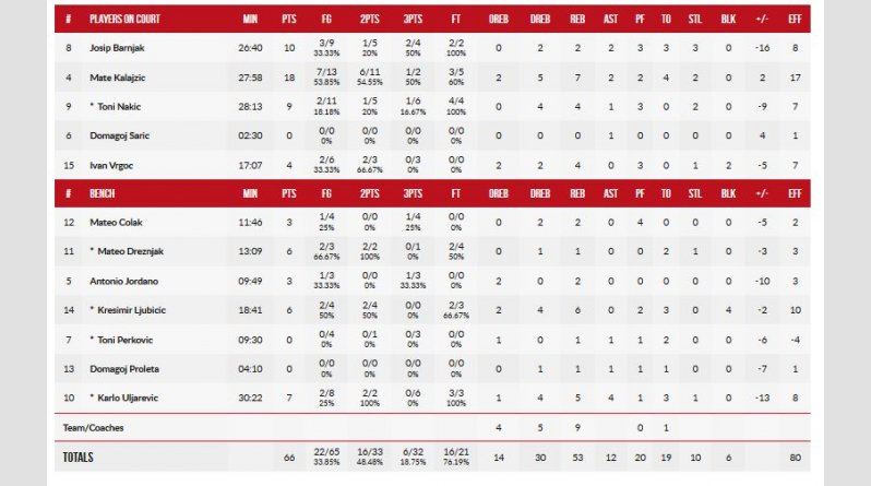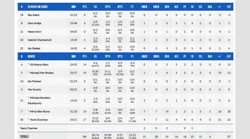 Η ομάδα του Ισραήλ ήταν μπροστά στο σκορ από την αρχή του αγώνα και δεν κινδύνευσε σε κανένα σημείο του παιχνιδιού. Η μοναδική στιγμή που κατάφεραν να απειλήσουν οι Κροάτες ήταν λίγο μετά την έναρξη του δεύτερου ημιχρόνου όταν μείωσαν στο καλάθι.