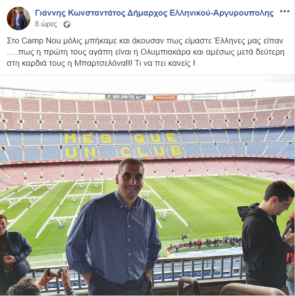 Ο Γιάννης Κωνσταντάτος είναι ο δήμαρχος Ελληνικού – Αργυρούπολης που επανεξελέγη με ποσοστό… Βόρειας Κόρεας το οποίο άγγιξε το 70%. Εκτός από άκρως πετυχημένος τοπικός άρχοντας όμως, είναι και φανατικός Ολυμπιακός. Αυτό το ήξεραν καλά όσοι τον γνωρίζουν προσωπικά, ήρθε όμως η ώρα να αποκαλυφθεί και δημοσίως. Με ανάρτησή του στο facebook, o Γιάννης Κωνσταντάτος ανέβασε φωτογραφία από την επίσκεψή του στο Καμπ Νου γράφοντας μεταξύ σοβαρού και αστείου:
