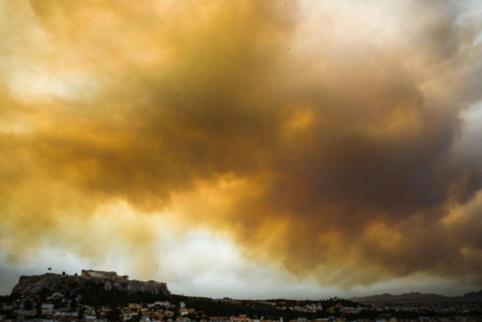 Η φωτιά μαίνεται ανεξέλεγκτη και την ίδια στιγμή ο καπνός έχει σκεπάσει την Ακρόπολη, τη Βουλή, την πλατεία Συντάγματος και όλο το κέντρο της Αθήνας, όπως φαίνεται από τις φωτογραφίες.