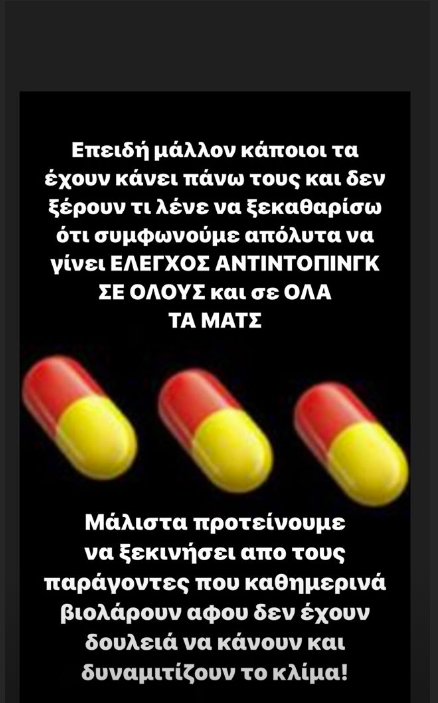 «Επειδή μάλλον κάποιοι τα έχουν κάνει πάνω τους και δεν ξέρουν τι λένε, να ξεκαθαρίσω ότι συμφωνούμε απόλυτα να γίνει ΕΛΕΓΧΟΣ ΑΝΤΙΝΤΟΠΙΝΓΚ ΣΕ ΟΛΟΥΣ και σε ΟΛΑ ΤΑ ΜΑΤΣ. Μάλιστα προτείνουμε να ξεκινήσει από τους παράγοντες που καθημερινά βιολάρουν αφού δεν έχουν δουλειά να κάνουν και δυναμιτίζουν το κλίμα!», έγραψε χαρακτηριστικά.