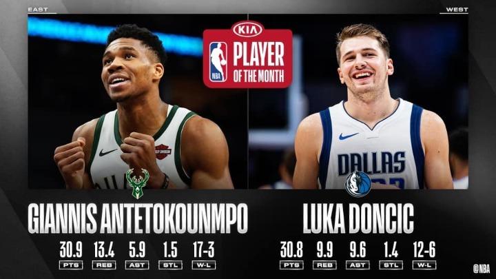 Κορυφαίοι παίκτες για το μήνα Οκτώβριο/Νοέμβιο αναδείχθηκαν στο NBA οι Γιάννης Αντετοκούνμπο και Λούκα Ντόντσιτς σε Ανατολή και Δύση αντίστοιχα. Μάλιστα, έγιναν οι πρώτοι ξένοι στην ιστορία της Λίγκας που κατέκτησαν μαζί αυτό το βραβείο.