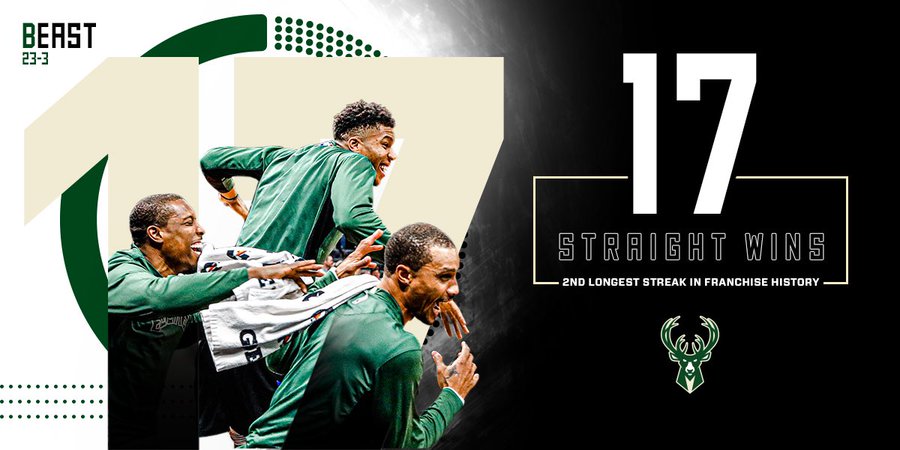 Το νικηφόρο σερί του Μιλγουόκι είναι το δεύτερο μεγαλύτερο για τα «ελάφια» και βρίσκονται μόλις τρεις νίκες μακριά από το να ισοφαρίσουν το μεγαλύτερο σερί στην ιστορία της ομάδας: το 20-0 της περιόδου 1970-71, όταν οι Μπακς είχαν κατακτήσει το μοναδικό τους πρωτάθλημα με ηγέτη τον Καρίμ Αμπντούλ Τζαμπάρ.