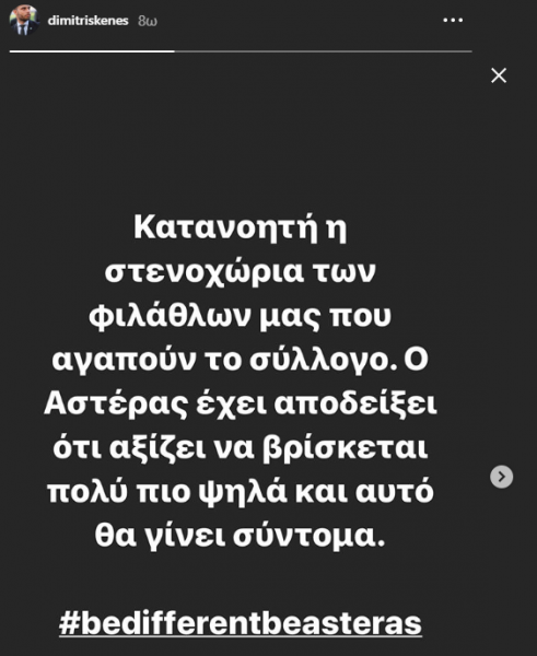 Μπορεί ο Αστέρας να γνώρισε τη συντριβή χθες από τον Ολυμπιακό στην Τρίπολη, ο αντιπρόεδρος των Αρκάδων όμως Δημήτρης Κενές, γεμάτος αισιοδοξία ανέφερε σε ποστάρισμά του, ότι η ομάδα αξίζει να βρίσκεται πολύ πιο ψηλά και αυτό θα γίνει σύντομα.