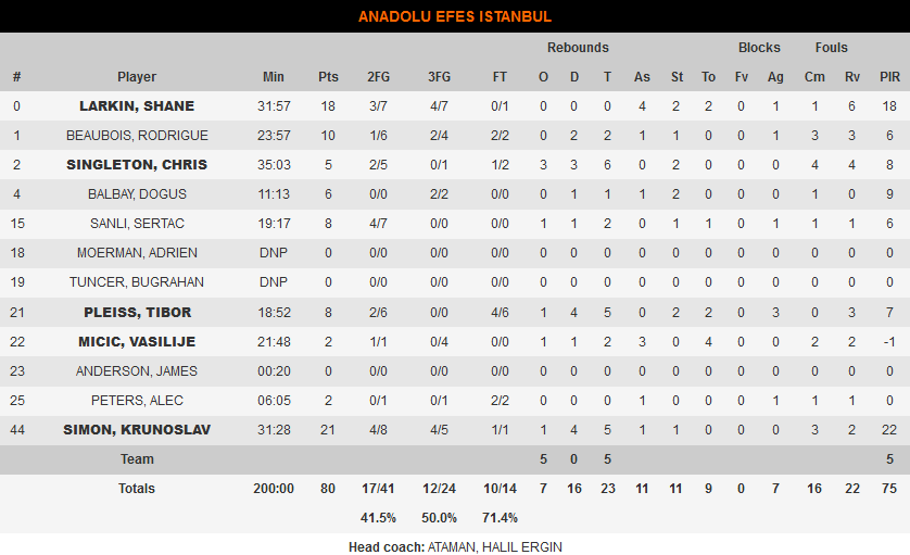 Εκεί με το σκορ στο 80-79 υπέρ των Τούρκων, ο Μάικ Τζέιμς (28 π) ανέλαβε την τελευταία επίθεση της ομάδας του και με ένα εύστοχο σουτ από μέση απόσταση έγραψε το τελικό 80-81, μιας και ο εξαιρετικός Σέιν Λάρκιν (18 π) δεν βρήκε στόχο στο τελευταίο σουτ του αγώνα.