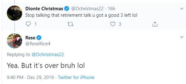 Ο Κρίστμας συγκεκριμένα ανέφερε: «Σταμάτα να μιλάς για απόσυρση, έχεις ακόμη τρία καλά χρόνια», αλλά η απάντηση του Ράις ήταν λακωνική: «Έχει τελειώσει»!