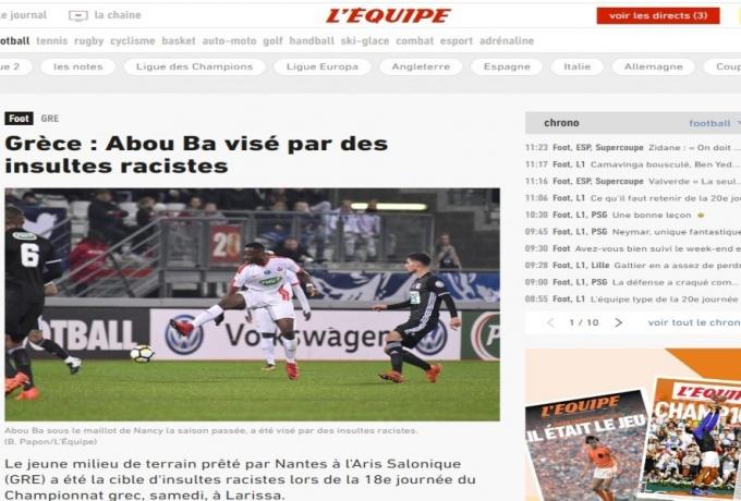 Θέμα στην «L ‘Equipe» έγινε η ρατσιστική επίθεση, θύμα της οποίας έπεσε κατά τη διάρκεια του αγώνα με την ΑΕΛ από μερίδα οπαδών των γηπεδούχων, ο Αμπού Μπα.