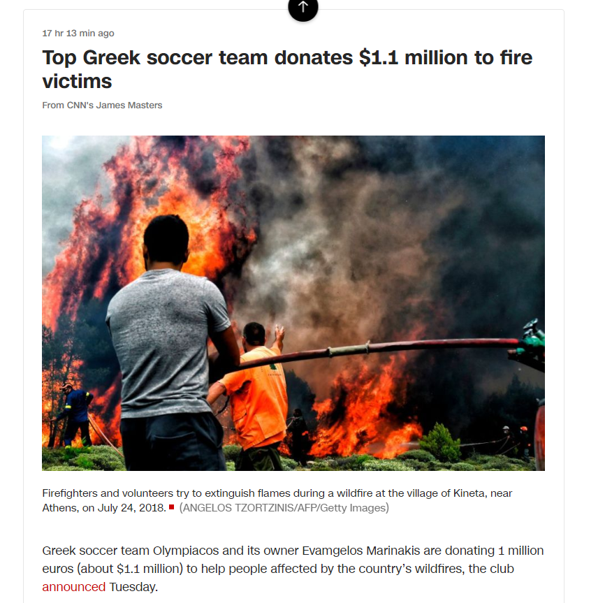 Το μεγαλύτερο ειδησεογραφικό δίκτυο του κόσμου δημοσίευσε νωρίτερα ένα θέμα, στο οποίο αναφέρεται η δωρεά της ΠΑΕ Ολυμπιακός και του Βαγγέλη Μαρινάκη ύψους 1 εκ. ευρώ για την ανακούφιση των πληγέντων της Ανατολικής Αττικής.