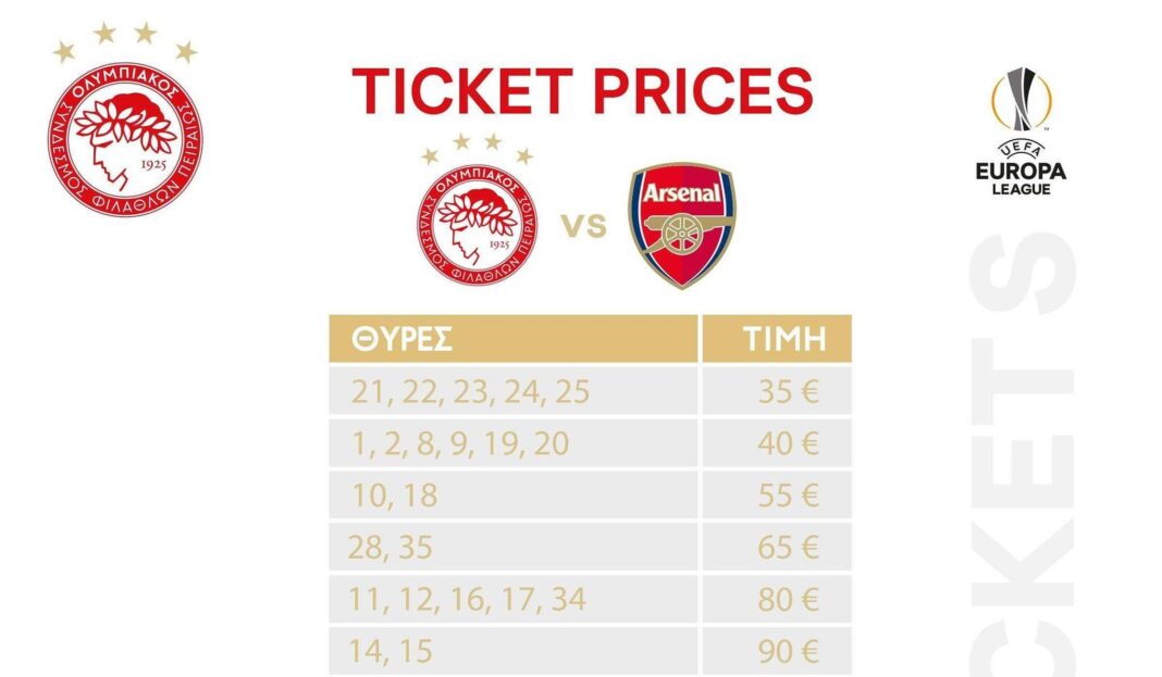 Ξεκίνησε σήμερα, τόσο από την επίσημη ιστοσελίδα του Ολυμπιακού όσο και από τα εκδοτήρια του «Γ. Καραϊσκάκης» η διάθεση των εισιτηρίων για τον αγώνα με την Άρσεναλ, στις 20/2, για το Europa League.