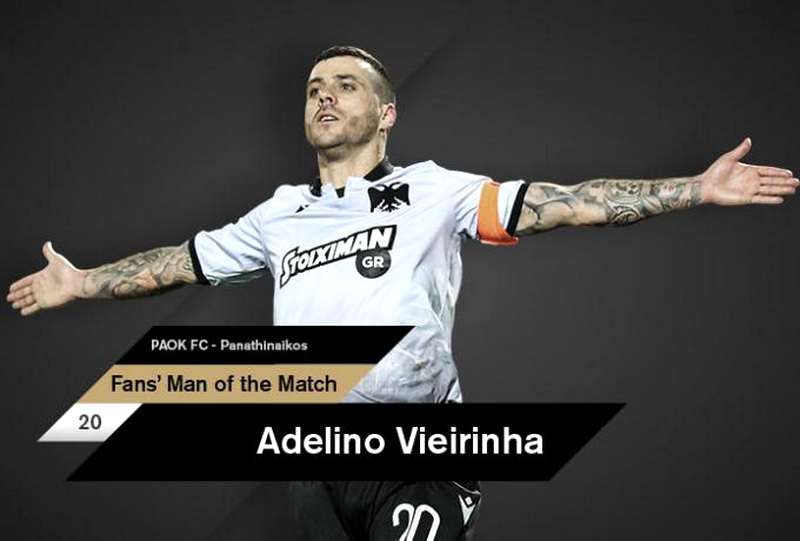 «Ο Αντελίνο Βιεϊρίνια αναδείχθηκε από το κοινό του paokfc.gr και του PAOK FC Official App, ως ο Fans’ Man of the Match του αγώνα κόντρα στον Παναθηναϊκό στο γήπεδο της Τούμπας για τα προημιτελικά του Κυπέλλου Ελλάδας.