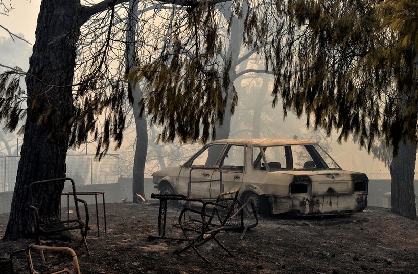 Πρόκειται για μια σωρό που βρέθηκε στο φράχτη του σπιτιού. Ενας άνθρωπος δίπλα από ένα αυτοκίνητο με ανοιχτή ακόμη την πόρτα, ο οποίος προφανώς όταν κατάλαβε ότι η φωτιά πλησίαζε και δεν μπορούσε να κινηθεί άλλο, βγήκε από το ΙΧ του για να απομακρυνθεί με τα πόδια. Δεν πρόλαβε. Αφησε εκεί την τελευταία του πνοή. Κουλουριάστηκε και περίμενε το θάνατο.
