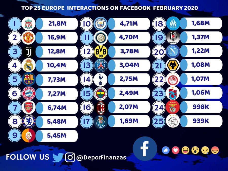 Την τριάδα συμπληρώνει η Γιουβέντους με 12,8 εκατ. και ακολουθούν δύο μεγαθήρια της La Liga, η Ρεάλ Μαδρίτης και η Μπαρτσελόνα.