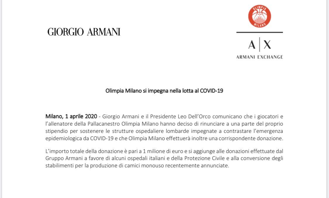 Όπως ανακοίνωσε η ιταλική ομάδα, το συγκεκριμένο ποσό δε θα εξοικονομηθεί απλώς για να μπει στα ταμεία του συλλόγου, αλλά θα διατεθεί στη στήριξη των νοσοκομείων της Λομβαρδίας που πλήττονται από την πανδημία, στην υπηρεσία πολιτικής προστασίας, καθώς και στη μετατροπή των εγκαταστάσεων των εργοστασίων της εταιρείας Αρμάνι αποκλειστικά στην παρασκευή προστατευτικών στολών για γιατρούς και νοσηλευτές.