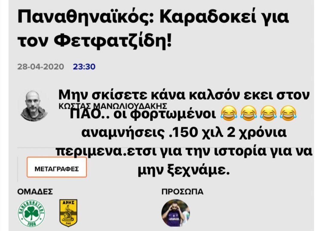 «Μη σκίσετε κανένα καλσόν εκεί στον ΠΑΟ… Οι φορτωμένοι αναμνήσεις. 150 χιλιάδες δυο χρόνια περίμενα. Έτσι για την ιστορία,για να μη ξεχνάμε», ήταν το σχόλιο του ισχυρού άνδρα της κίτρινης ΠΑΕ, που άφησε αιχμές για την περίπτωση Διούδη.